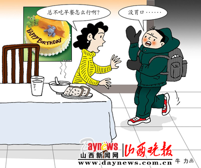 说起孩子早餐,太原市文华苑的李女士无奈地摇头:“我孩子今年上初三,年龄越大,越不好好吃早餐。”李女士说,“每天早上我都换着花样给孩子做吃的,牛奶面包、馄饨、面条、粥……可是孩子总是吃了几口就说饱了。说是吃了早饭,其实和没吃一样。”令李女士头疼的是,即便是给孩子钱,让他买合自己口味的早餐,也不能解决问题,“钱是给了不少,但孩子通常都是买了零食和小玩具了,根本就不买早餐。”