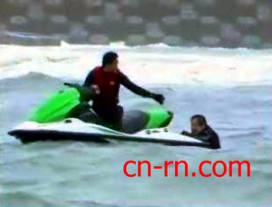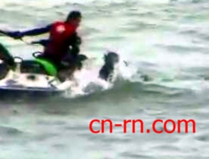 连忙爬上水上摩托车,拖回岸边。