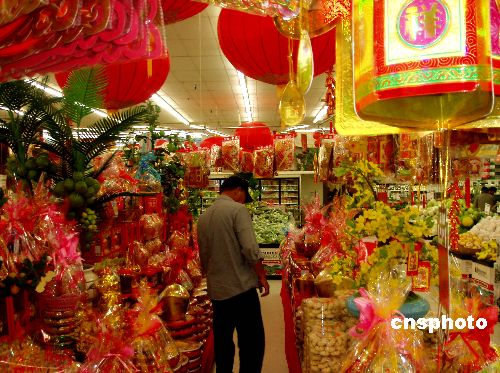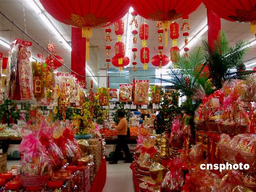 图:洛杉矶超市张灯结彩迎接中国农历新年 中国新闻网 中国新闻网官方账号 2008.01.2914:10 关注 一月下旬,美国洛杉矶东部华人华侨聚居的中国谷地区超级市场里,摆放着来自中国大江南北的年货,张灯结彩迎接中国农历新年。中新社发 贾国荣 摄