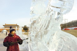 图:昨日下午,来自哈尔滨的冰雕师正在玉佛苑内雕刻冰灯。