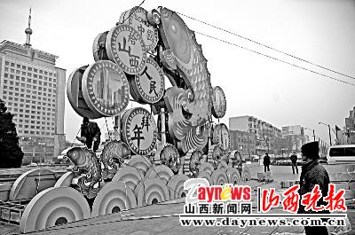 昨日,一个近10米高的巨型鱼状花灯亮相太原市五一广场,为省城增添了许多节日的气氛。据现场施工的负责人介绍,广大市民今晚就可以欣赏到它亮灯时的美丽造型。