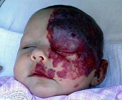 刚出生时,贝基前额上长有一个微小的红点,当时护士没有在意,只是简单地处理了一下。在接下来的6周时间里,这个小红点开始急剧“发育”、迅速长大,扩展至整个左脸,贝基的脸蛋变成了可怕的“阴阳脸”。更严重的是,“胎记”开始影响贝基的视力,就连吃奶都很困难。