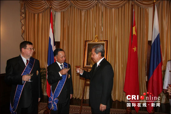 国际在线报道(记者 陆永江):泰国总理素拉育1日在曼谷总理官邸代表普密蓬国王授予中国驻泰国大使张九桓“特级泰皇冠勋章”,以表彰张大使为促进中泰睦邻友好合作关系做出的杰出贡献。