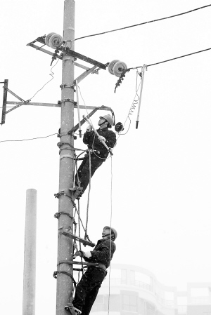 1月28日,大雪中电力工人们在硚口冒雪抢修。记者陈卓 摄