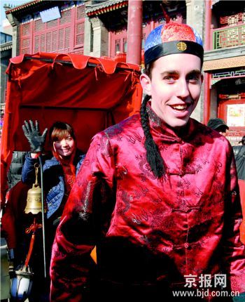 “洋姑爷”拉洋车过年 北京晚报 《北京晚报》官方账号 2008.02.0918:24 关注 昨天是农历正月初二,是天津的女婿们给岳父母拜年的“法定日子”,天津人称之为“姑爷节”。几名“洋姑爷”来到天津古文化街,包饺子、拉洋车、欣赏中国民俗文化。 新华社赵惠祥摄