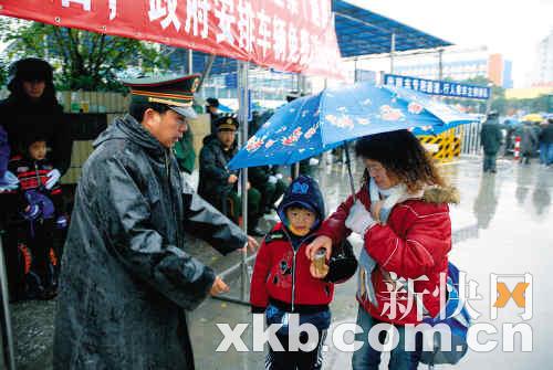但就是这样不苟言笑的粗线条指导员,说起战士们来却如数家珍,哪个战士的大衣湿了、雨衣破了,哪些战士每天穿着湿衣、湿鞋执勤,哪个是南方人怕冷,哪个哪里又受伤了……他还早早为战士们买来保暖的羽绒衣、御寒手套,叮嘱战士买来成箱的雨鞋,雨天在闸口免费向等候的旅客发放……而他执勤时,最牵挂的竟是自己带的那数百名留在部队训练的新兵。“十天没见到了,回去了得赶紧去看看……”