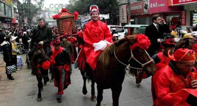 海峡都市报2月11日报道9日(正月初三),下午4点,福建平潭县城。一列身穿唐朝古装的迎亲队伍,吹吹打打,走街串巷。队伍前头是三匹高头大马,坐着的新郎与两位傧相均是高鼻深目的老外,后头花轿边上甩着花帕的喜婆居然也是一名老外。