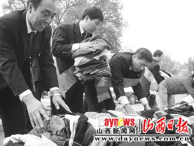 “友爱车队”队友们正在为阳曲县的受灾群众捐献衣物