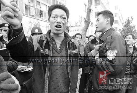 据李贤堂说,其家兄弟4人来昆明已有多年。二哥李贤友以前受过伤,医治好后便身带残疾,与二嫂在昆明做米线生意。上午10点左右,他知道二哥送饵途经人民东路时被城管打了,就迅速跑了来。“看到二哥躺在地上,饵散落一地,我就跑到一辆白色面包车前,拦住去路,没想到,七八个男子就过来打我,他们那么多人,我咋个还手,打得我头昏眼花,我只好抓住先打我的那个不放手。”