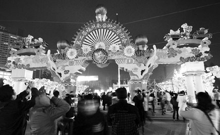 昨日下午,记者来到五一广场先睹为快。广场上已聚集了不少前来观灯的市民,他们要么举着相机、要么拿着手机,与各个灯组合影留念。