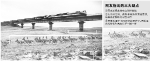 网友dajiala称,2月10日,当他经过北京5号线地铁的照片展出处时,偶然发现了这一疑点。“我注意到照片因为斜着放置,上面积了一些灰尘,就下意识地低头要吹一下浮尘,这个时候,我突然看到了一个奇怪的细节:在图片的最下方,有一道十分明显的线,这个时候,我的心里突然一震……仔细观察,这明显是一道拼接的痕迹,出现在照片的最下方……我当时突然冒出了一个让我不愿相信的想法:如果火车和藏羚羊是两幅照片,那么,那个‘决定性的瞬间’不就成了很简单的PS技巧了吗?”