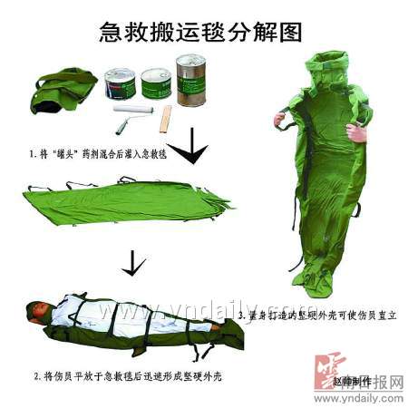昨天,医护人员演示了用急救搬运毯救护伤病员的全过程。他们从草绿色军用书包中,取出一个用特殊布料制成的人形套子,还有4只装有填充剂的铁盒“罐头”。在地上展开人形套后,倒入“罐头”中的填充剂。填充剂快速发泡,体积不断膨胀。再用一个小滚筒来回滚动,把填充剂碾压均匀。“伤员”在医护人员的帮扶下,躺进人形套子,套子很快依照“伤员”的形体,变成了一个坚硬的“模具”,“伤员”如同装进坚固外壳的“木乃伊”。医护人员随即将人形套两侧的布带拉拢,把“伤员”的身体牢牢捆扎在其中。两名护士抓住人形套上的提手,轻轻松松就拎起来,搬上停在门外的急救车上。