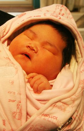 2月24日,济南市第五人民医院的护士正在护理“巨婴”(前)和一名体重正常的婴儿。