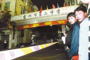 本报讯 广东省雷州市第二中学25日19时35分左右发生一起凶杀案,一名辍学青年冲入高二年级的教室,先后用刀杀死2人、砍伤4人后,用刀捅伤自己的腹部,并跳楼自杀身亡。