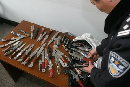 俩店铺查缴55把管制刀具 东亚经贸新闻 2008.02.2901:44 关注 警方收缴的刀具 记者 李磊 摄东亚讯(记者 崔颜锋) 针对社会上一些人员非法携带管制刀具进入公共场所,给社会公共安全造成极大危害的情况,昨日,南关公安分局治安中队决定利用两天的时间,开展收缴管制刀具专项行动。 行动中,民警先到辖区内各繁华场所进行走访,发现在全安批发市场上,有两家店铺出售管制刀具。民警立即进行收缴,在两家店铺内共查缴管制刀具55把。目前,两名店铺老板分别被治安拘留5天。