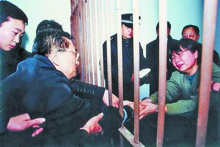 “慕马大案”:2001年8月,根据法院判决,原沈阳市长慕绥新、常务副市长马向东严重违纪违法,分别被判处死缓和死刑。从1999年7月到2001年6月,慕马案的重要涉案人员,除了市府的一二把手(慕、马),还牵扯出了包括财政局长、国资局长、法院院长、检察长等委办局的17个一把手和一百多名领导干部,其中涉及党政机关、司法机关、行政机关、执法机关、经济管理部门等多个单位。涉及收受贿赂等违法违纪行为的沈阳市处级以上官员已达到400多人,收缴和扣押赃款、非法所得2亿多元人民币。该案涉及的领导干部之多,涉案金额之大,所造成的后果之严重,均为新中国成立以来所罕见。上图为马向东执行死刑前与妻子离别。
