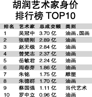 这份艺术榜以2007年全年在世中国艺术家的艺术品公开拍卖市场价格(包括拍卖中介费)为依据,共列出了排名前50位的艺术家。排名第二的是中国少壮派油画家张晓刚,去年作品成交额达2.88亿元;旅法油画大师赵无极名列第三,其作品成交额达2.84亿元。