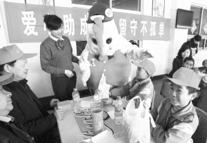 图为来自肯德基的“奇奇”为留守儿童分发午餐。