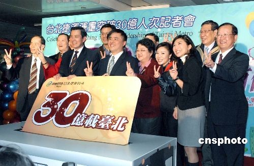 台北市捷运运量累计突破三十亿人次。图为三日下午台北捷运台北车站内,台北市前任市长马英九、现任市长郝龙斌等参加庆祝记者会。中新社发 曾嘉 摄