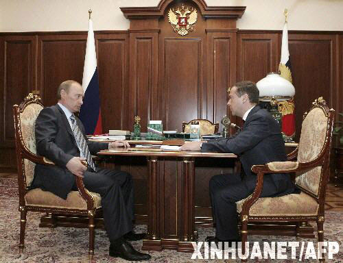 3月3日,俄罗斯总统普京(左)与现任第一副总理梅德韦杰夫在莫斯科克里姆林宫会晤。普京当天建议与梅德韦杰夫一起决定下届政府构成问题,并让其组织召开国务委员会主席团会议。 新华社/法新
