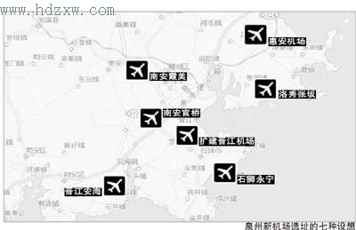 扩建晋江机场方案已基本被放弃,因为扩建用地等原因,专家们认为扩建与大泉州城市建设有冲突;交通规划中还讨论了惠安机场、洛秀张坂地区选址方案,认为机场选址这两处用地和所处位置不太理想,有较多难以实现的困难;而新机场如果设在南安霞美,则与泉州湾核心发展地区太近,而且周边用地条件不理想,不利于发展相关产业;选址南安官桥,机场可以服务泉州,还可以缩短与厦门之间的距离。但有专家认为选址这个地方与正在建设的福厦高速铁路太近,因此这个方案也被否决掉了。如果新机场选址在泉厦交界的安海地区,则可以更接近泉厦交界地区,但也因用地、地形条件和与厦门机场飞行空域之间的相互影响等原因,无法继续支持未来的机场发展。
