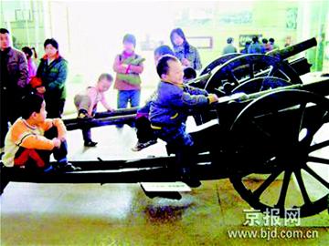 虽然军博事先对一些珍贵文物加封了玻璃罩或栏杆,还增加了警示牌,可就在进门的大广场上,六门铁炮前的围栏已完全“躺倒”,不少孩子在家长的鼓励下跨进围栏,爬到1米高的铁炮上拍照。