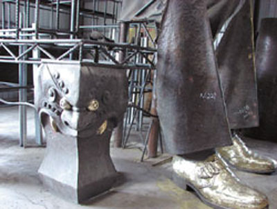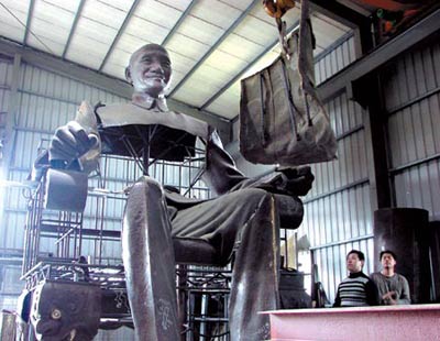 据报道,号称岛内最大坐姿的蒋介石铜像,去年3月被高雄市政府大卸成200多块,昨天修复的“雏型”在桃园大溪“两蒋文化园区”重现;但由于碎片实在太散还是无法完全重建,艺术家们便运用现代解构主义的手法,让蒋介石坐在钢架上。大溪镇公所预计下月初就可以修复完成。