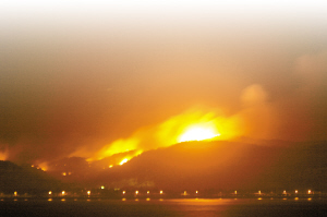 本报汕头讯 (记者陈正新 通讯员汕宣、林小乐摄影报道)前晚在汕头濠江区燃起的山火(上图)于昨晚再次复燃(详见本报3月5日A15版),复燃后的山火沿风向已经蔓延到位居“汕头八景”之首的礐石风景区。汕头市委书记黄志光也于昨晚前往火场指挥灭火工作。