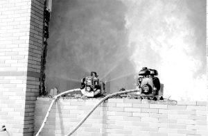 昨日下午3时许,在试验现场,消防队员打开两辆细水雾消防车中的喷水雾机器(约有30厘米长、10多厘米宽、10多厘米高),只见喷出的雾气把火场一楼的窗户给遮住。两名消防队员拿着细水雾消防车内的水枪冲向火堆灭火,没多长时间大火就被扑灭。