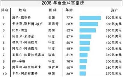 排名姓名 国籍 年龄 资产1 沃伦·巴菲特 美国 77岁2 卡洛斯·斯利姆·埃卢 墨西哥 68岁3 比尔·盖茨 美国 52岁4 拉什米·米塔尔 印度 57岁5 穆凯什·阿姆巴尼 印度 50岁6 阿尼尔·阿姆巴尼 印度 48岁7 英瓦尔·坎普拉德家族 瑞典 81岁8 KP-辛格 印度 76岁9 奥莱格·德里帕斯卡 俄罗斯 40岁10 卡尔·阿尔布里特 德国 88岁620亿美元600亿美元580亿美元450亿美元430亿美元420亿美元310亿美元300亿美元280亿美元270亿美元