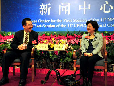 昨日,全国人大代表林毅夫(左)、陈云英夫妇共同接受记者采访。新华社记者 刘泉龙 图