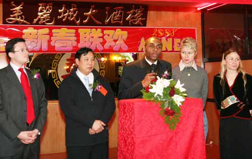 陈文雄与顾梅区长在巴黎华人社团迎新春团拜会上。(法国《欧洲时报》)