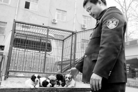 中午12时许,机动中队队长张进福和执法队员开车载着5只狗崽,来到政七街上的郑州市流浪犬收容站,把它们交给这里的工作人员。