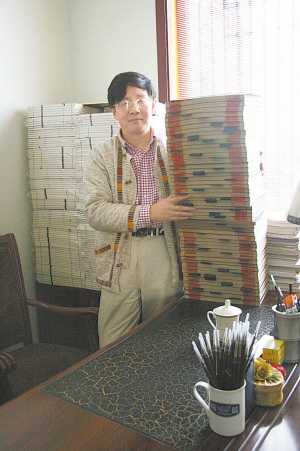 昨日,记者来到五通桥区朱万明的家中,看见书桌上的手抄本已垒起了约1米高,轻轻打开,一排排繁体字工整有力。“整部手抄本共86本,共有370多万字。”
