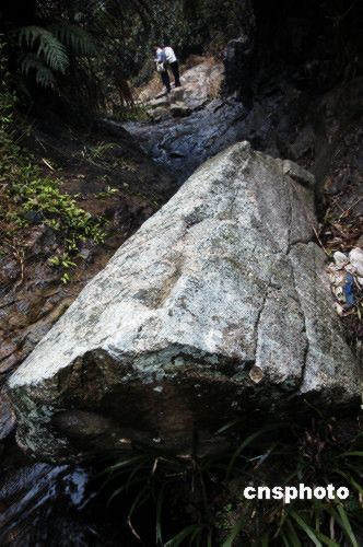 3月13日,一村民向游人丈量惟妙惟肖的“棺材石”。在江西赣县的大埠乡一山谷中,一块奇石呈现在游人眼前。这块“棺材石”长约2.7米、高约1米、重达数吨,是一种叫麻条石的石质材料,石头表面光滑透亮,一头大,一头小,上面还有棺材盖印迹,令人不得不惊悸大自然的鬼斧神工。中新社发 刘念海 摄