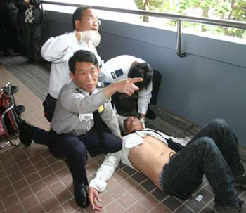 图:当日袭击贩管队的男子在混乱中也受伤,图为救护人员替其治理。(图片来源:大公报)