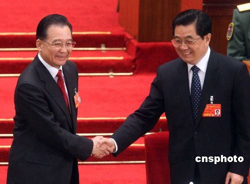三月十六日上午,十一届全国人大一次会议在北京人民大会堂举行第六次全体会议,会议经过投票表决,决定温家宝为中华人民共和国国务院总理。图为国家主席胡锦涛祝贺温家宝再次担任国务院总理。中新社发 张宇 摄