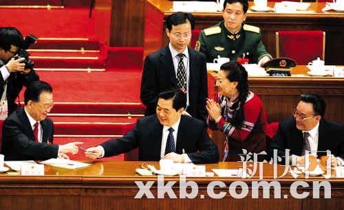 昨天,十一届全国人大一次会议第六次全体会议间隙,一位名叫梁美兰的女代表走到大会主席台,依次请吴邦国、胡锦涛、温家宝三位党和国家领导人在她投完票的选票封套上签名留念。吴邦国委员长和胡锦涛主席签过名后,温总理微笑着答应签名却一时没找到笔,坐在一旁的胡主席看在眼里,立刻拿出自己的笔递给温总理。这时,梁美兰代表双手合十连声道谢。