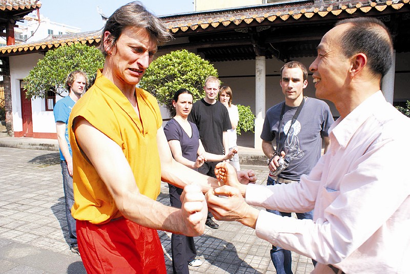 德国拳师JanHintenl—mann说,他从网络、书籍等途径了解到广东 “咏春拳”的源头是永春白鹤拳,钦佩之余,经一位来过永春学拳的德国朋友介绍,专门来与永春白鹤拳师学习的,他觉得白鹤拳很有内涵。