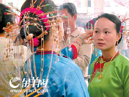 东升渔村的“大王爷节”上,多姿多彩的莫过于身着盛装的渔妇了,而她们头上插满的如同孔雀开屏一样的金饰,更是黄灿灿地“渐欲迷人眼”。这服装和这头饰,只有结了婚的妇女才能穿戴。渔妇们三五成群地聚在一起时,一步一摇,华丽的头饰把每个渔妇都摇曳得风情万种起来。嫁到外地的东升女也盛装回家。今年与往年相比,现在渔村的生活也好了,姑娘们更爱更会打扮了,头上插的金饰也更多、更贵重了。
