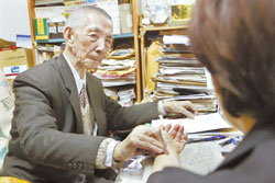 高龄99岁的台湾老中医师姜通目前还在看诊,问诊相当谨慎仔细。身为家族第十代中医的他,到现在还用毛笔写处方。(台湾《中国时报》图姚志平摄)