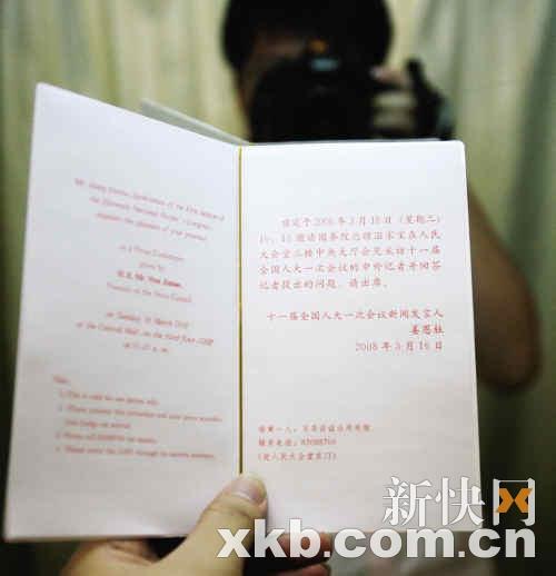 昨天下午,本报记者拿到了两会新闻中心发来的请柬(见左图,宁彪/摄)。该请柬为米白色,长约13cm,宽约7cm,比一巴掌略大,内文为红色字体,中英文对照。请柬的封面上印有金黄色的“请柬”两字和人民大会堂,内文如下:“兹定于2008年3月18日(星期二)10:15邀请国务院总理温家宝在人民大会堂三楼中央大厅会见采访十一届全国人大一次会议的中外记者并回答记者提出的问题。”最后署名为十一届全国人大一次会议新闻发言人姜恩柱。