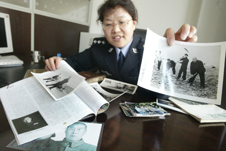 图片说明:甄雷鸣向记者展示父亲的照片等资料。