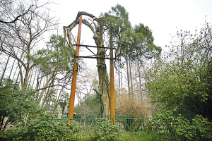 这株千年古树位于东南大学校内西北角,因年代久远已显出垂垂老态。它矗立在梅庵南侧,被两层铁栅栏“保护”着,两侧架着粗粗的铁杆,远远望去像一位拄着拐杖的倔强老人。记者走近一看,还有两根小钢管和三个铁环共同支撑着它,钢管直插入树干,露出黑漆漆的树洞,让人不禁心惊。站在栅栏边探身细看,记者发现古树的树皮已经裂开,中间是灰白的颜色。据东大一位同学说,古树的树干内部已经死去,完全靠外面的树皮传输养分,为了支撑树干,古树的内部被掏空后浇注了砂石。