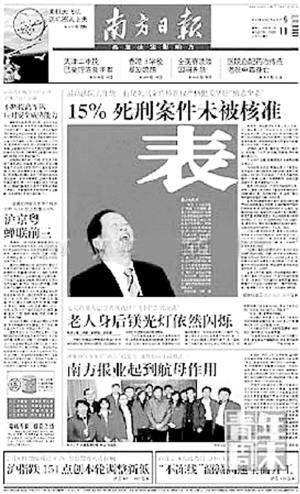 “肖扬到广东代表团参加审议,对广东的媒体来说就是当天的大新闻。我选了五六张比较中规中矩的图片提供给文字记者,用做配图。这张经过剪裁以后的大笑特写,我发给了一个图片专栏——‘辉影两会’的编辑。‘辉影两会’是放在第六版或者第七版的一个我个人在‘两会’期间的图片专栏。定位就是发一些比较‘活’的两会照片,有点会场花絮的性质。我个人非常喜欢肖扬大笑的照片,所以当天就只给‘辉影两会’的编辑发了这张图。他也觉得这张图很好,定了要用。但是到晚上10时,编辑给我打电话,说那张照片被头版编辑拿走了,要我赶紧再发一张‘两会’花絮给他。”