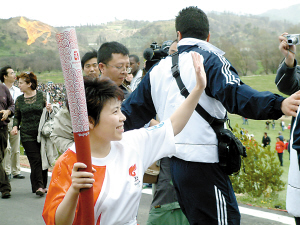 亚历山大出来了,他将自己火炬上的圣火之苗递到了罗雪娟那支火炬的点火处。罗罗举起的双手有些颤抖,她的期待正在实现。作为火炬全球传递的真正意义上的第一棒,接下来,她要完成双倍于亚历山大的路程的——因为原定第三棒的希腊选手出现意外骨折,罗罗必须跑完400米,将手中的火炬交给下一棒的火炬手。
