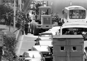 本报讯(记者 朱晓强)昨日下午,江北观音桥环道阳光城红绿灯处发生一起车祸,一名不识路的司机驾驶一辆装载机下坡时突然失控,在冲上路边花台挂倒路灯后,又撞向了一辆等候红绿灯的7系新宝马。受此影响,观音桥环道堵车两小时。