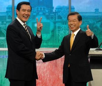 资料图:马英九与谢长廷在选举前第二场电视辩论会开始时,应主持人要求相互握手,两人比出自己的号次,加深选民印象。