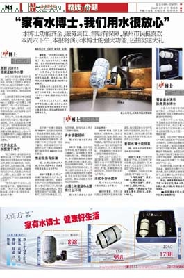 本报讯 “用水博士过滤水,烧水一段时间后,水壶里的水垢层不见了!嘿,我给全家人买了个健康呢!”家住市区宝洲街的刘阿姨,花898元给厨房装上一台“水博士”,用了一段时间,觉得真是物超所值。