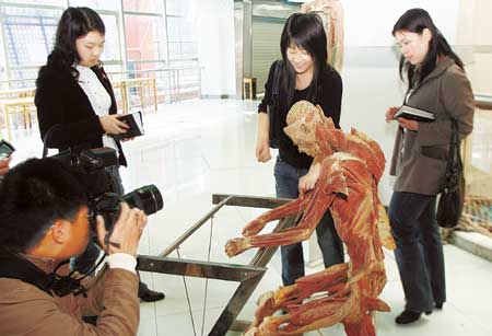 “制作这样一具完整的人体标本至少要2年的时间。”负责展览的组委会策划部部长范业君解释说,这些造型优美的标本都是经过塑化技术处理的,标本解剖后要经过脱水脱脂,在真空条件下将同等比例的树脂嵌入组织代替水分和脂肪。塑化标本无毒无味且干燥,结构清楚,持久耐用,皮肤保持弹性光泽,可用手触摸,具有良好的感观性,摆脱了福尔马林浸泡式标本强烈的刺激性气味和对人体健康的毒副影响。